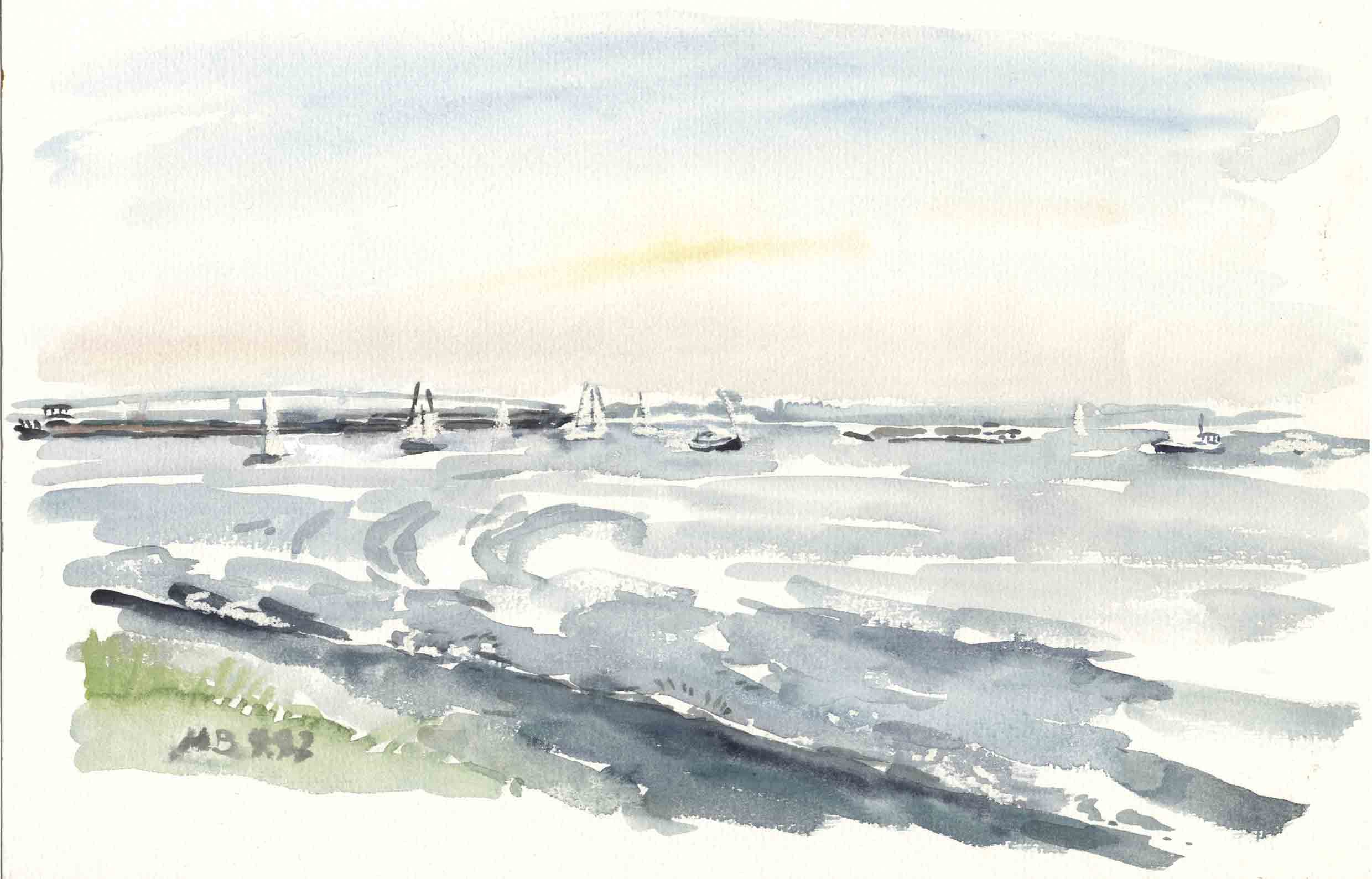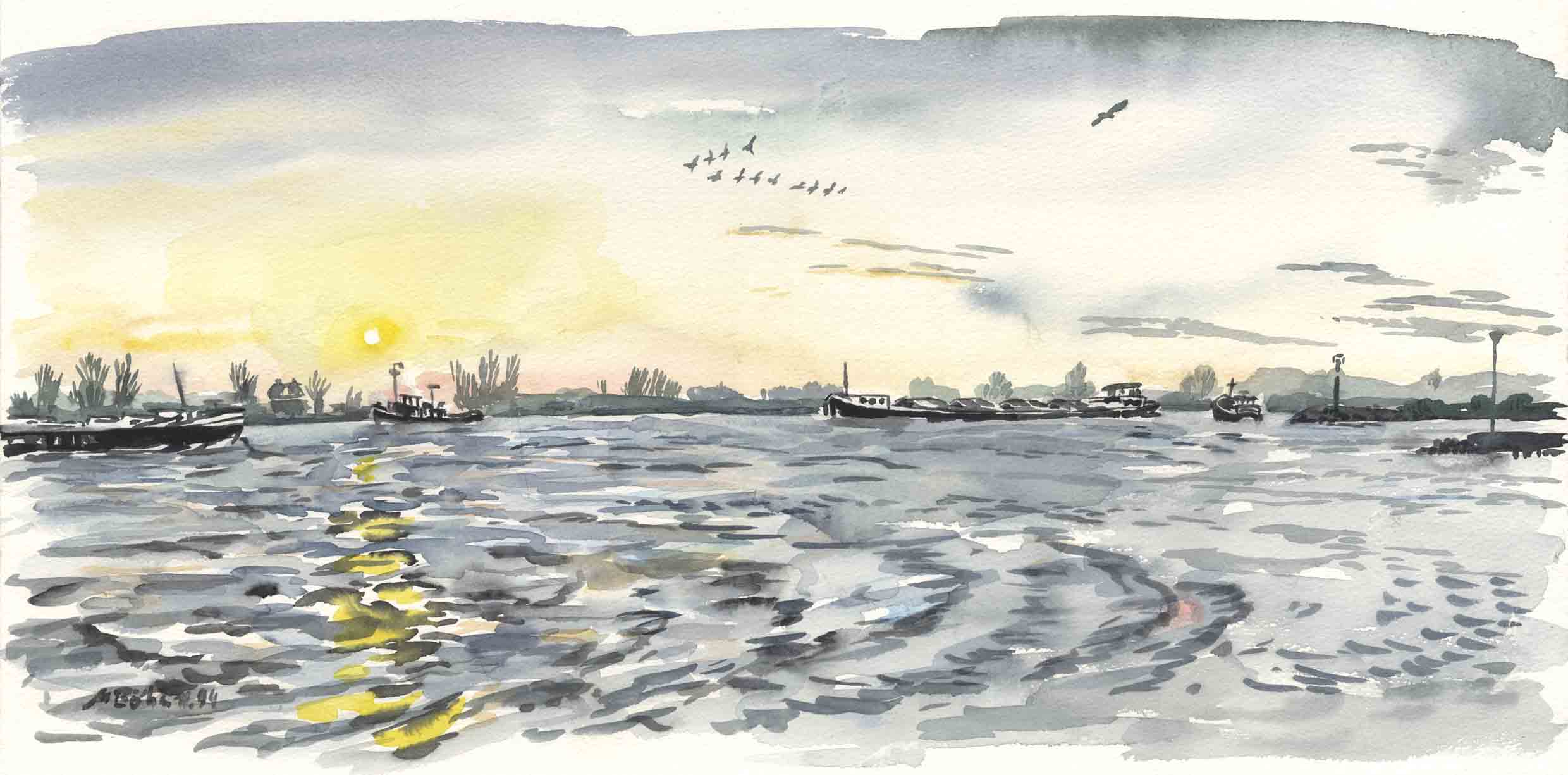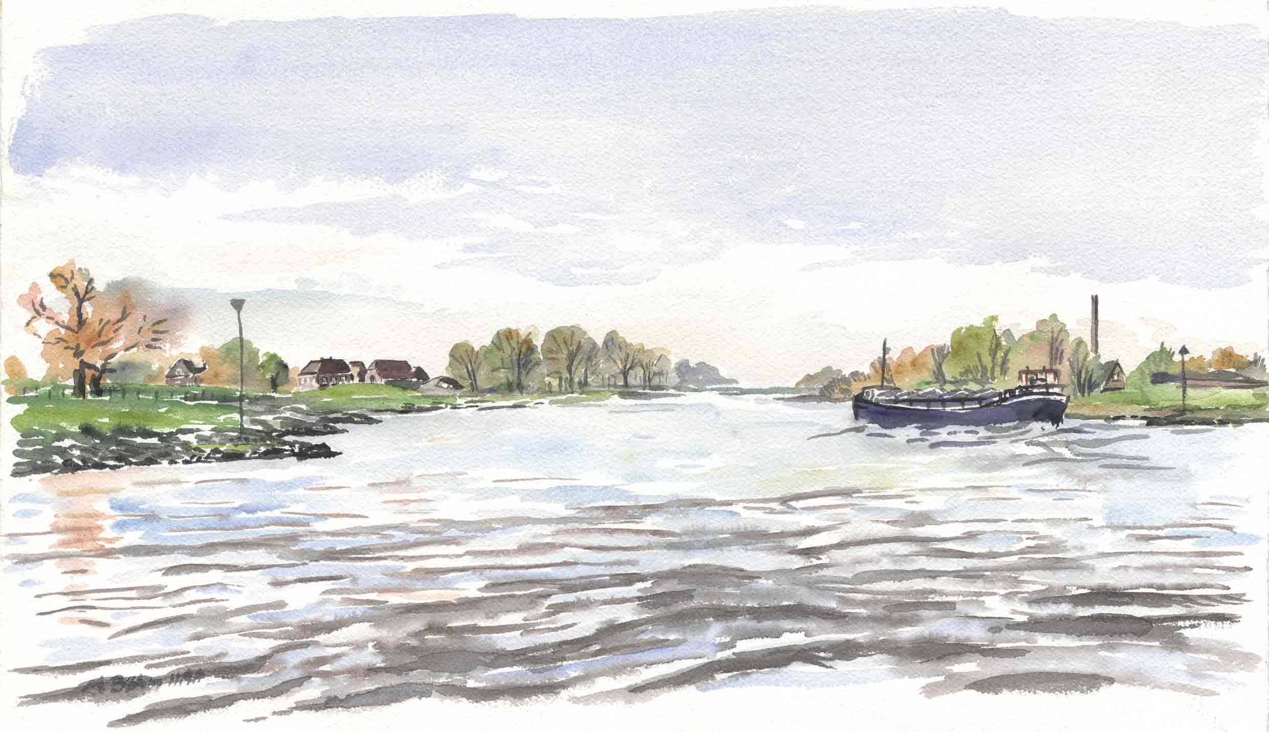 Rijn, Waal, Merwede, Noord, Maas, Nederrijn, Oude Rijn, Lek, die Mündungsarme des Rheins innerhalb der Niederlande. In einem kleinen Dorf bei Köln aufgewachsen bin ich es gewohnt, die Welt linear anzuordnen: es gab rhein-aufwärts und rhein-abwärts, und dann gab es noch die andere Seite, für mich als Kind ein Wunsch-Land, das immer wieder in meinen Träumen auftauchte. Hier in den Niederlanden bilden die Mündungsarme zusammen mit den Kanälen ein unübersehbares Netz von Wasserstrassen.