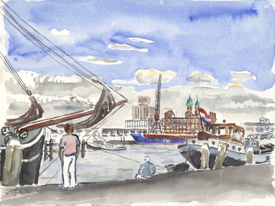 An einem seitlichen Hafenbecken für kleinere Schiffe in Rotterdam, Clemens sitzt auf der Kante und zeichnet, ich mache ein Aquarell, was macht eigentlich der Mann mit der weissen Hose?