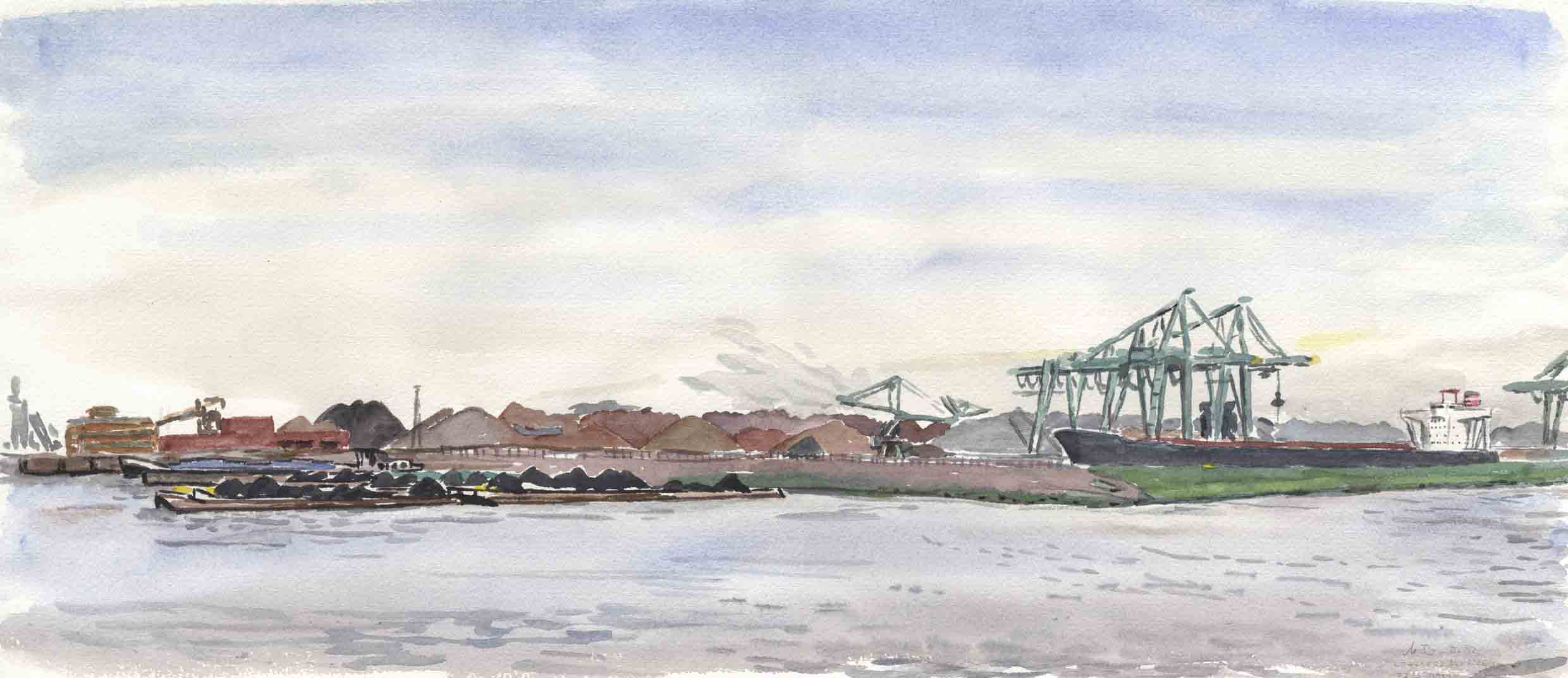 8-W-04-Aq-LowlandsSunrise-9-1992 | Der Erzhafen von Rotterdam, wird hier das Erz auf kleinere Schiffe verladen und nach Duisburg verfrachtet? (siehe dort) | ||