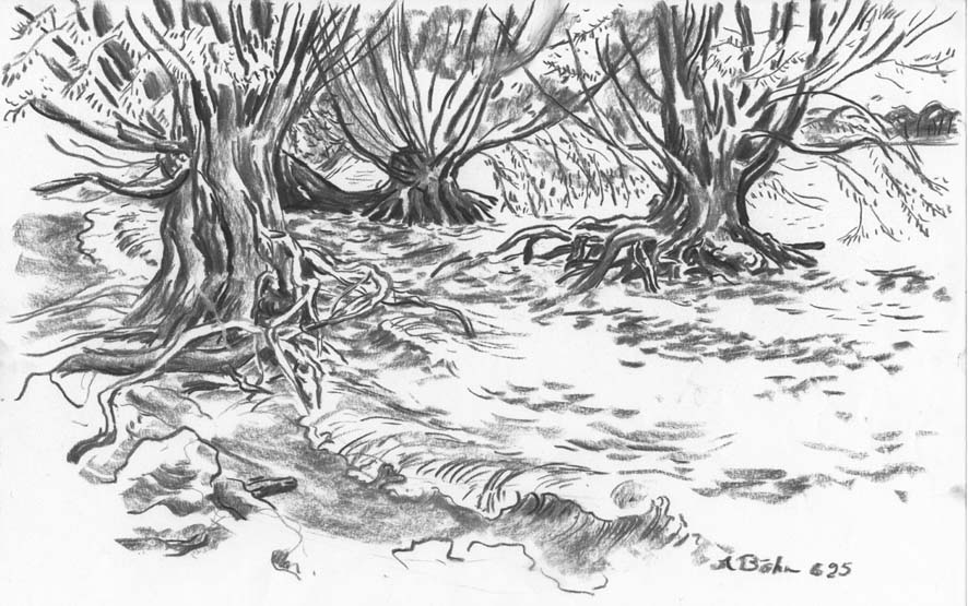 8-W-15-Ko-Weiden-steenoven-6-1995 | Weiden beim Campingplatz "Steenoven". Ich finde am Ufer seltsame Steine, glasige Felsbrocken mit ungewöhnlichen Stukturen; dann erkenne ich,was es ist: Fehlbrände von übereinandergestapelten miteinander verschmolzenen Ziegelsteinen. Die Erde auf den Äckern in der Nähe ist sehr lemig, überall in Flußnähe gibt es Lehmgruben. Hier muss früher wohl eine Ziegelei gestanden haben. | |||