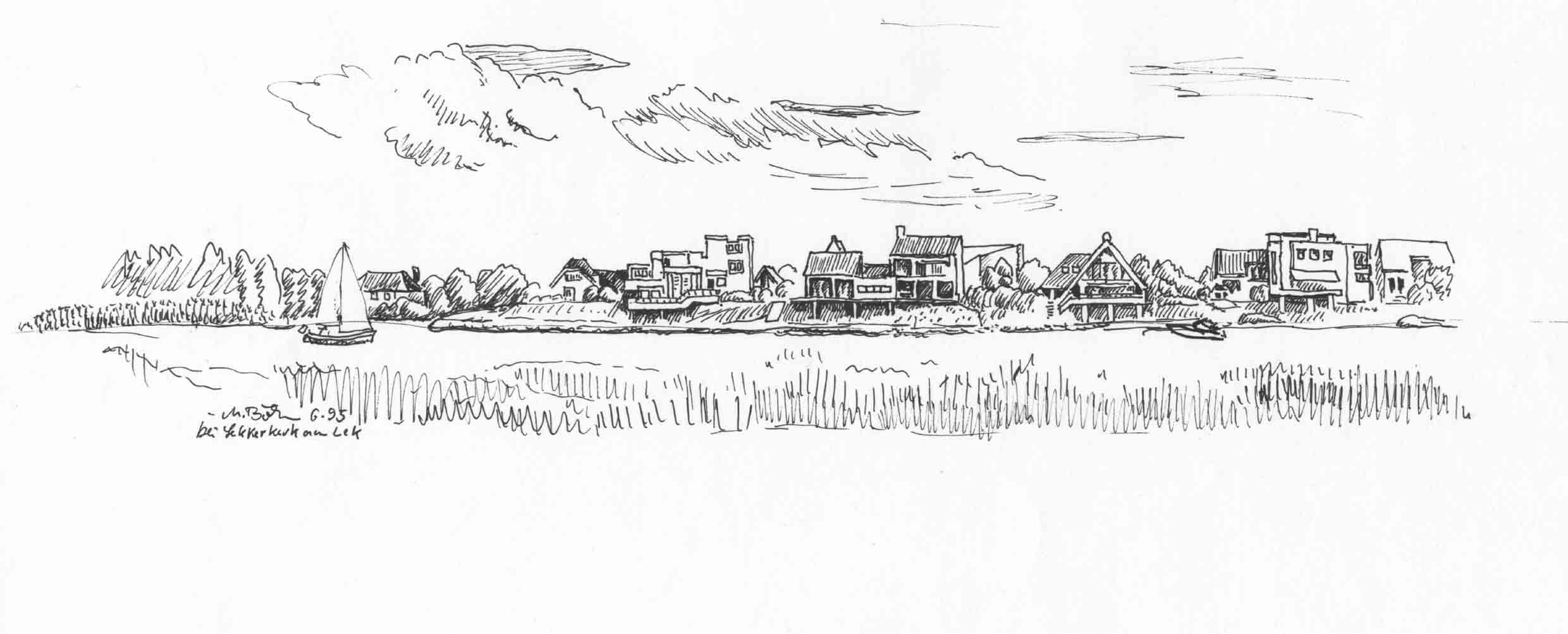 8-W-20-Fz-Lekkerkerk-6-1995 | Der Nederrhein wird zum Lek bei Wijk bij Duurstede, dort wo auch der Oude Rijn abzweigt. Die Häuser stehen sehr dicht am Ufer, ich wundere mich: der Pegel steigt wohl nicht sehr hoch hier bei Hochwasser. | ||
