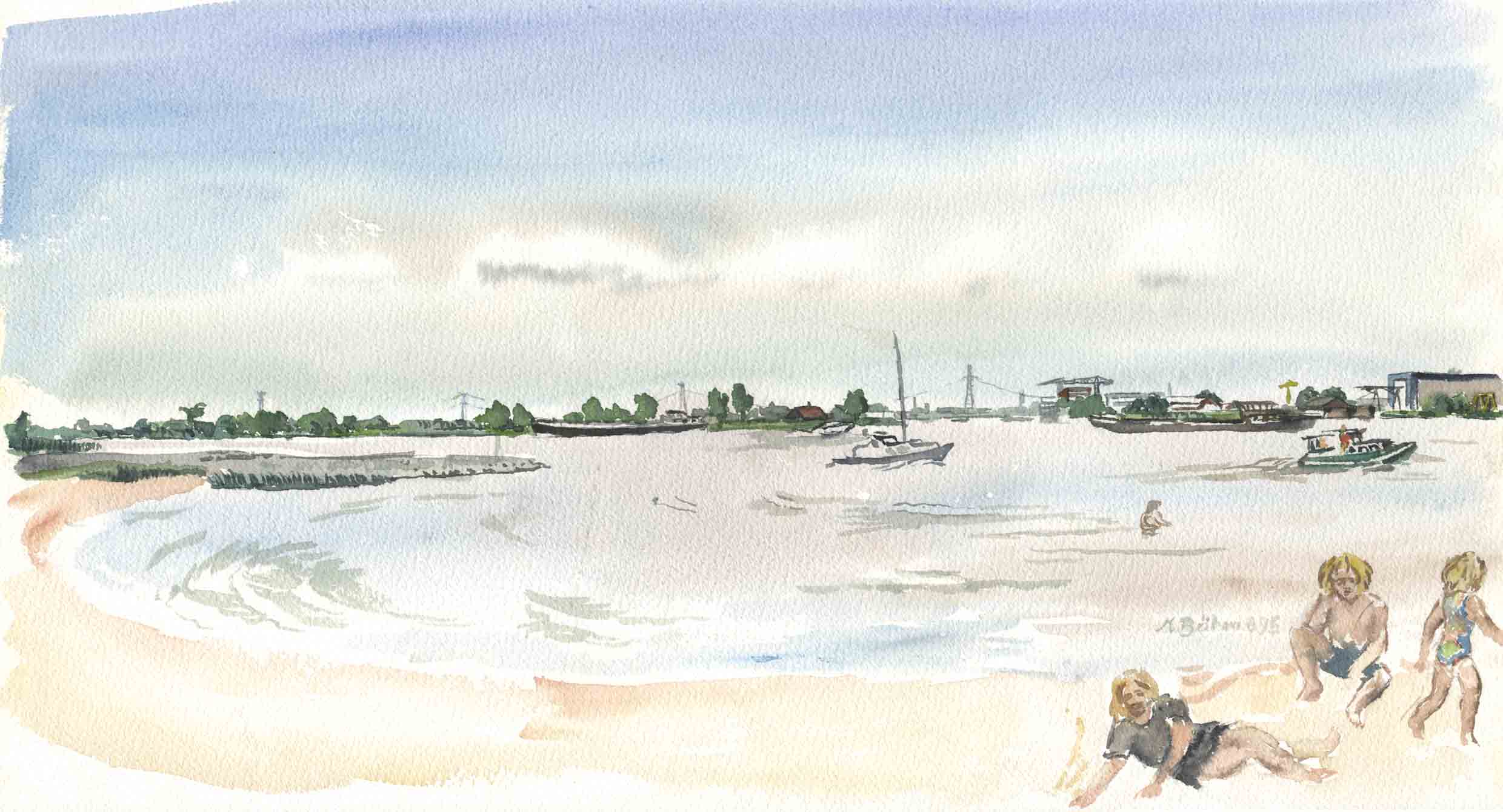 Die Merwede und die anderen Flussarme und Kanäle, ein viel befahrenes, für mich unübersichtliches Netz von Wasserstrassen. Zwischen den Kribben, diesen zungenförmig in den Strom meist aus Basalt hinein-gemauerten Dämme, immer wieder schöne Sandstrände. |