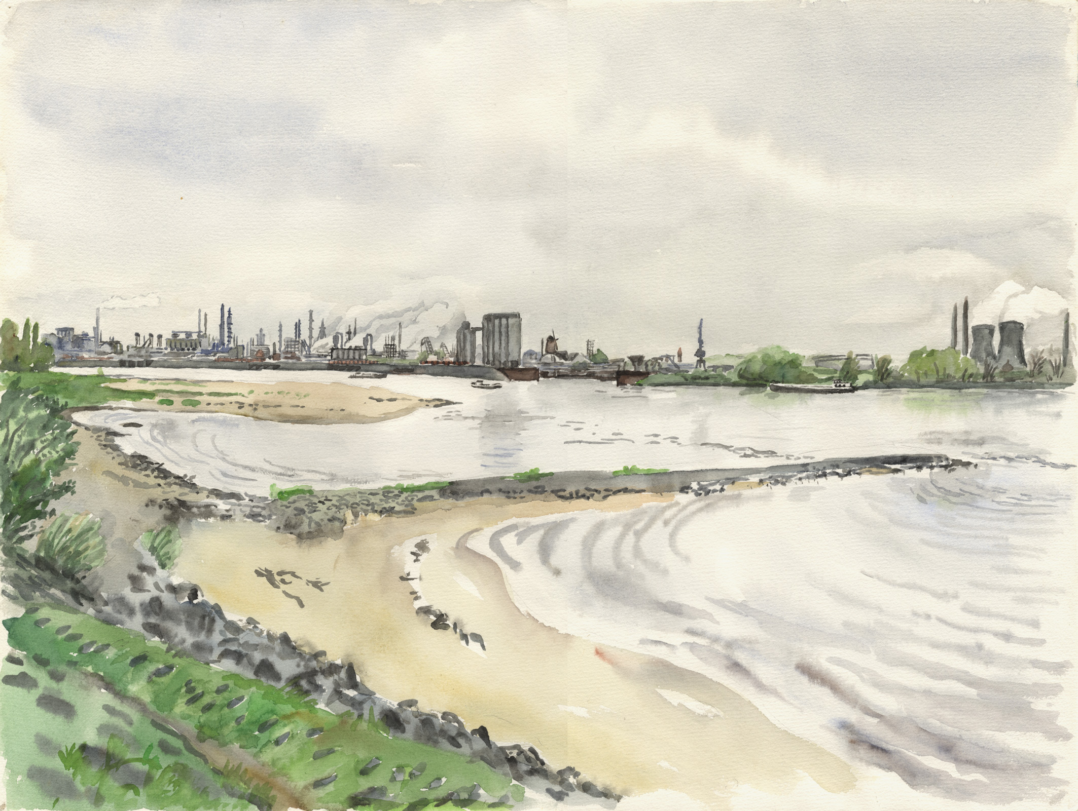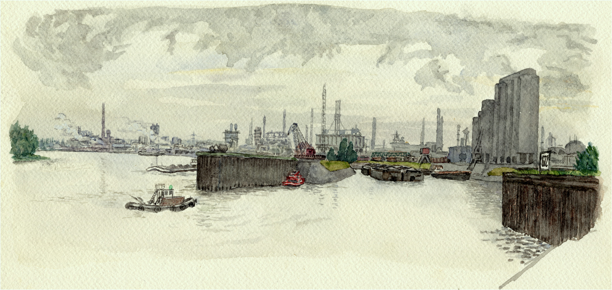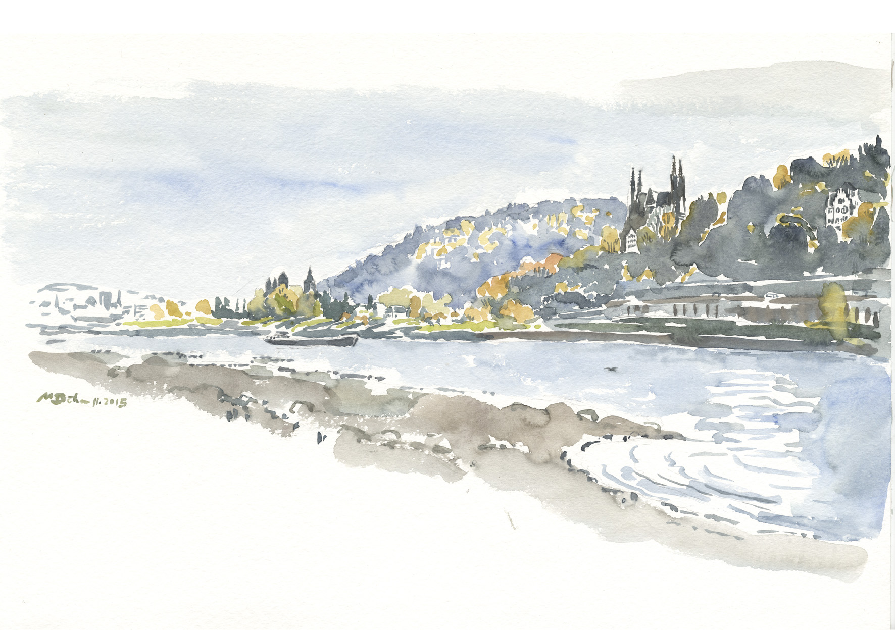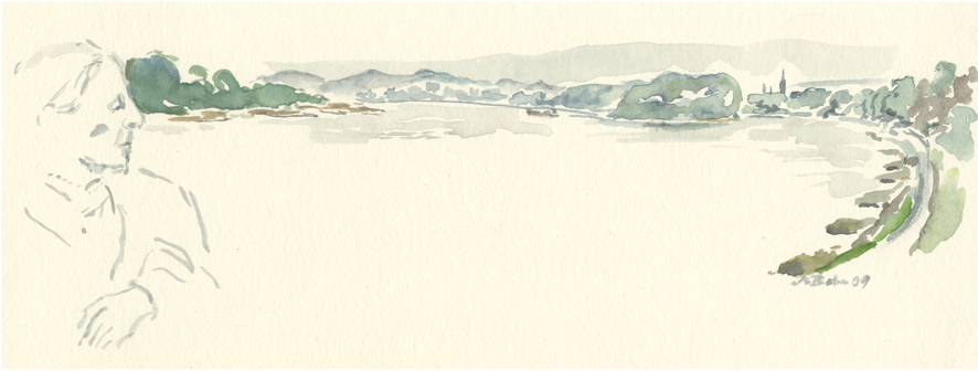 Blick von Andernach rheinabwärts nach Norden. Die Strasse auf riesigen Pfeilern so rücksichtslos und gigantisch dass sie fast schon wieder originell ist; überall in der Region von Koblenz bis Remagen sind solche Strassenführungen zu sehen. Die Stadt Andernach hat eine großenteils erhaltene Altstadt; die Uferseite ist genial versaut in einer einzigartigen landschaftlichen Lage. Papa zeichnet auch. | ||