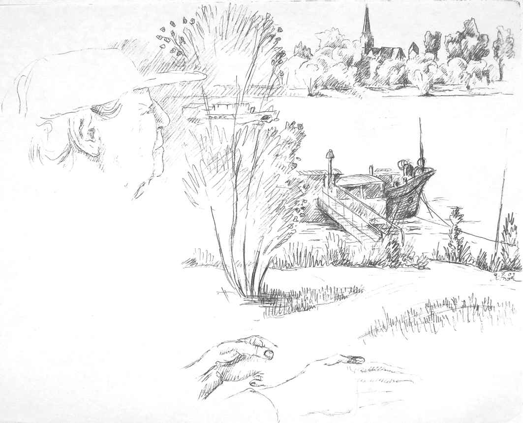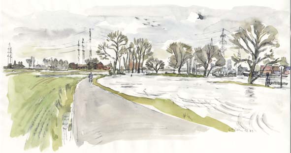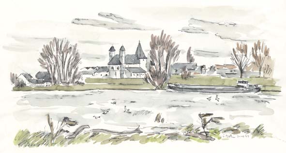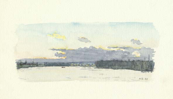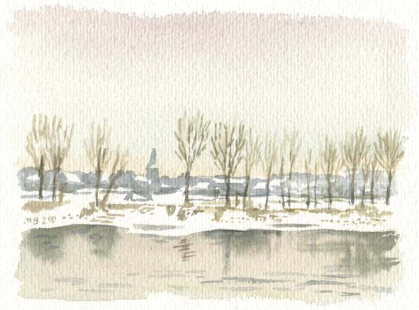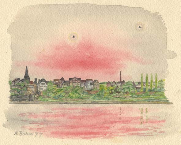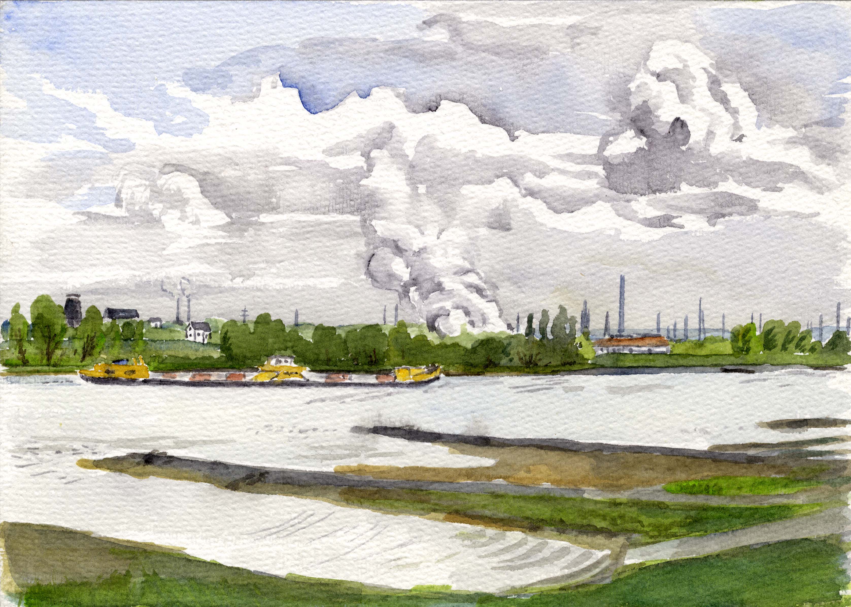 6-K-06a-Aq-Suerth-19xx-TMP | von Sürth aus. Der Rhein macht hier eine steile Kurve, die Industrie (Nobel) liegt auch in ufernähe, direkt gegenüber von Wesseling. Aus einigen der Türme stieg manchmal - und steigt glaube ich auch heute noch - eine riesige Flamme empor, wenn unbrauchbares Gas abgefackelt wurde. Wesseling: der Nahme kommt von "wessel de Ling", wechsle die Leine, wenn die Treidel-Schiffer wegen der Enge der Kurve die Leine wechseln mussten - genauer weiß ich es auch nicht. Im Vordergrund die Kribben zur Regulierung der Strömung. | |||