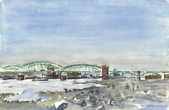 6-K-22-Aq-Suedbruecke-u-19xx | im Winter, auf den Kiesbänken mit gefrorenen Wasserpfützen, unterhalb der Poller Wiesen. Gegenüber das "Siebengebirge", das sind die Speicherhäuser des Rheinau-Hafens | |||
