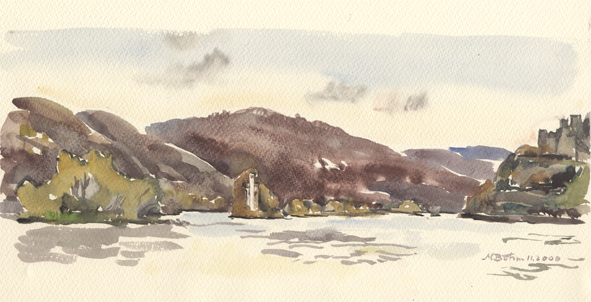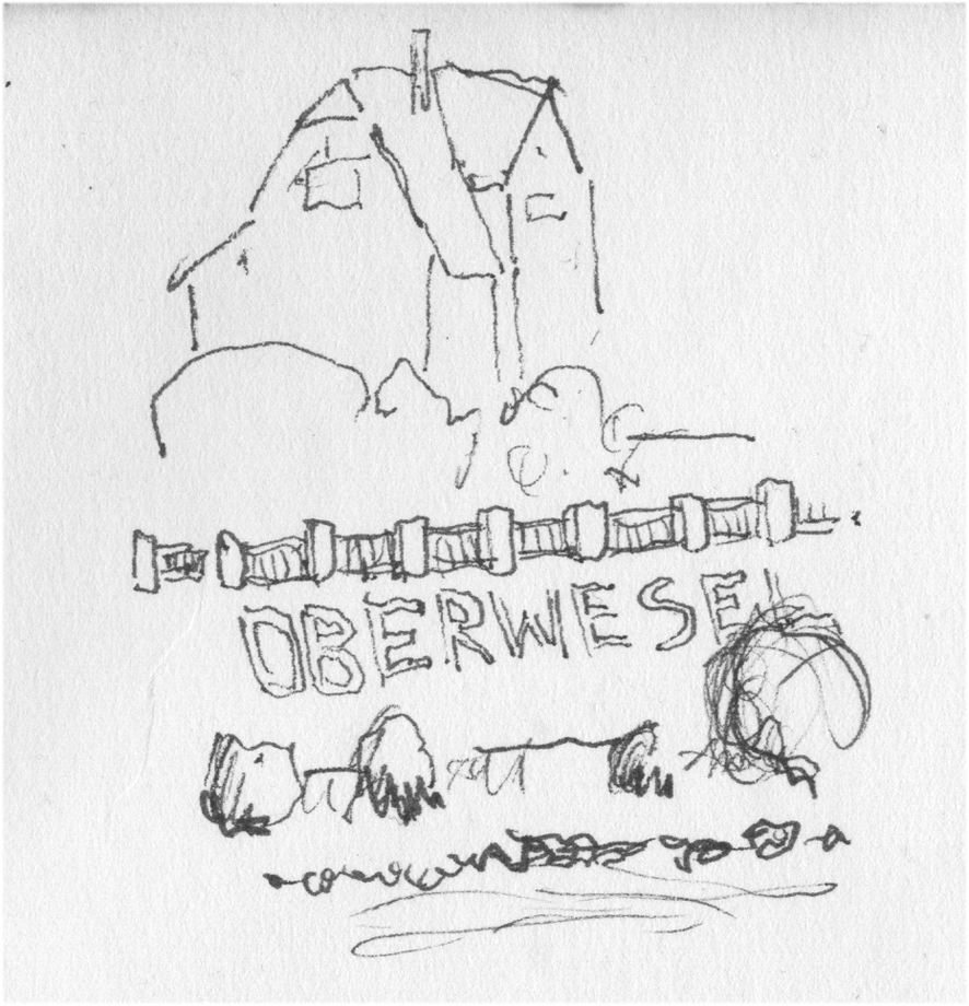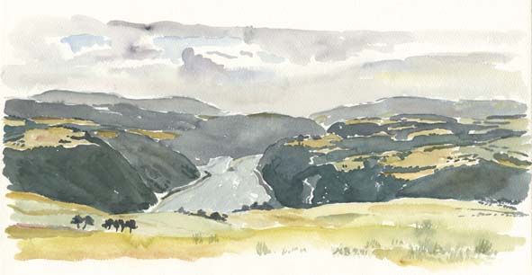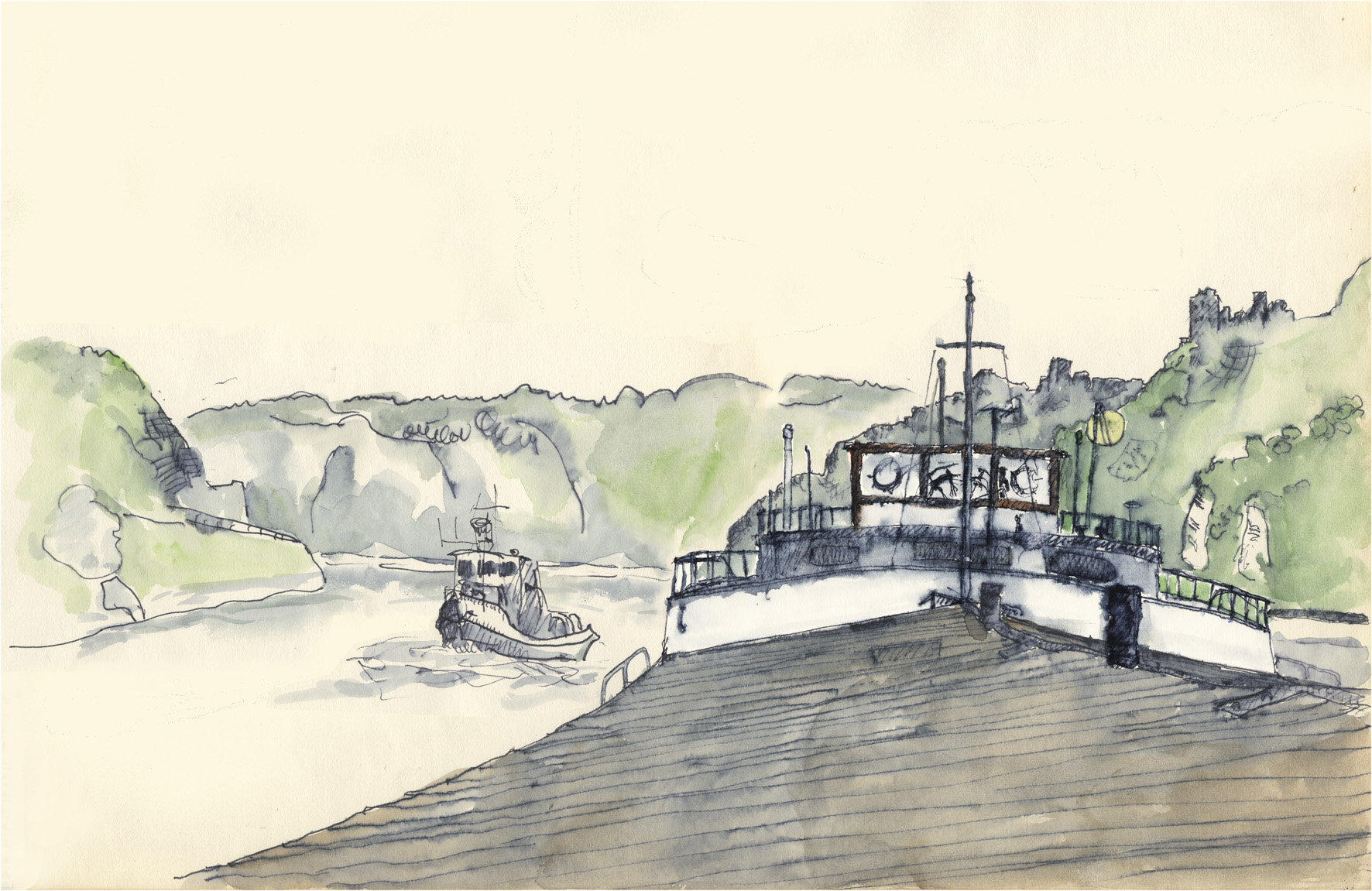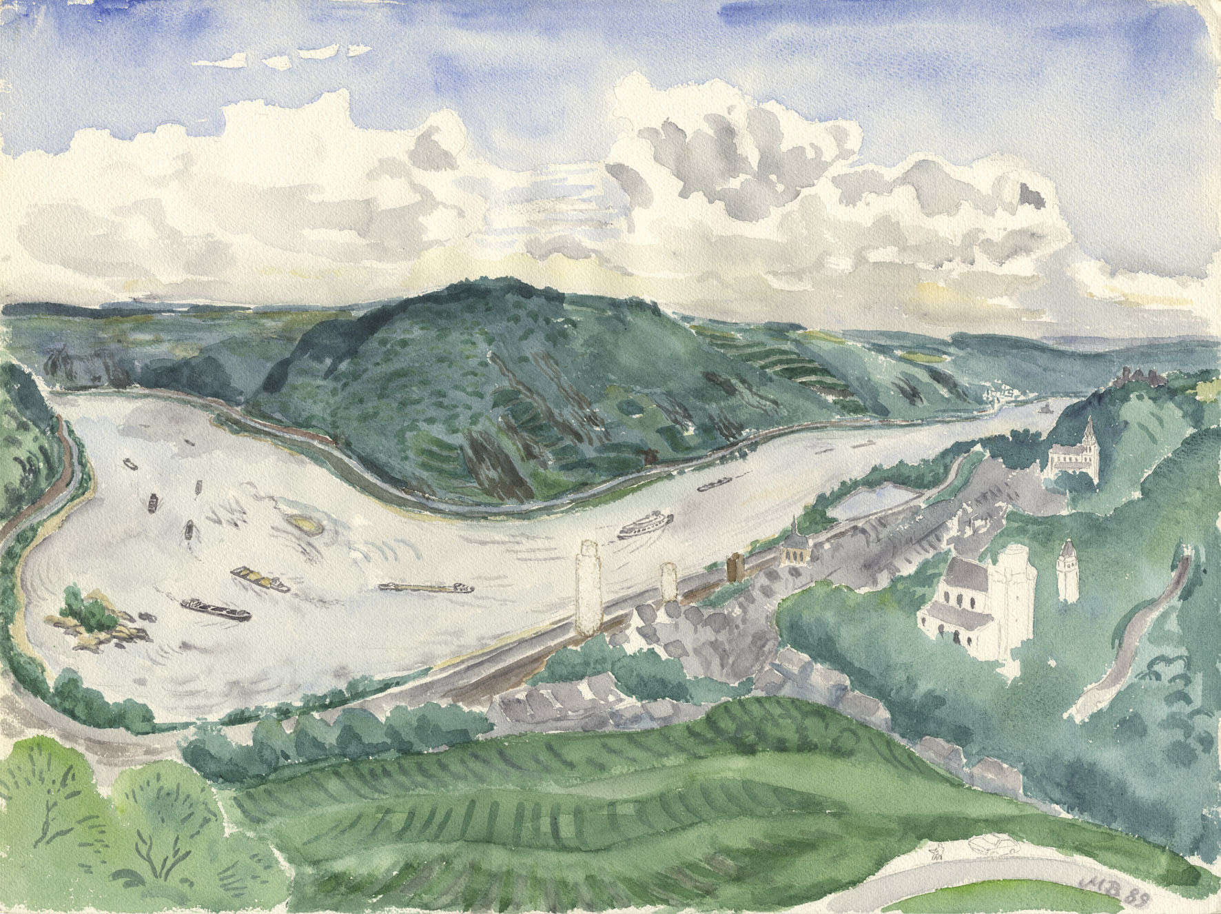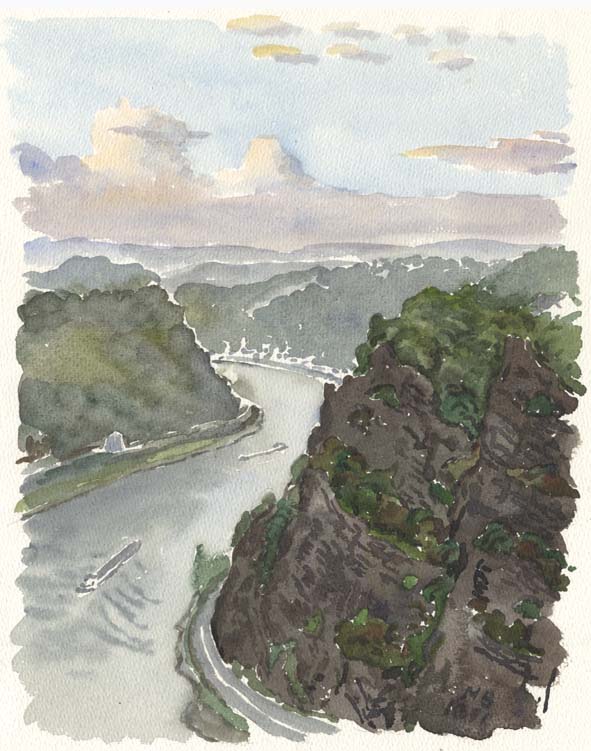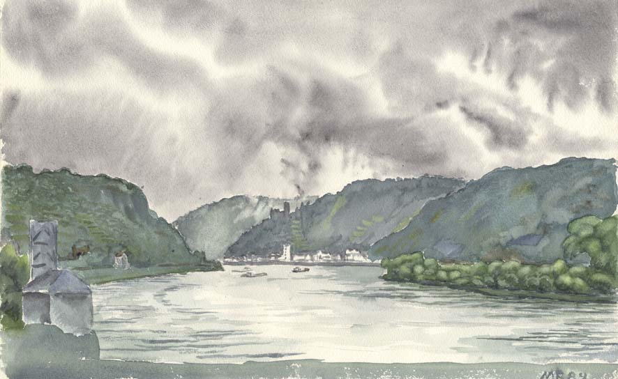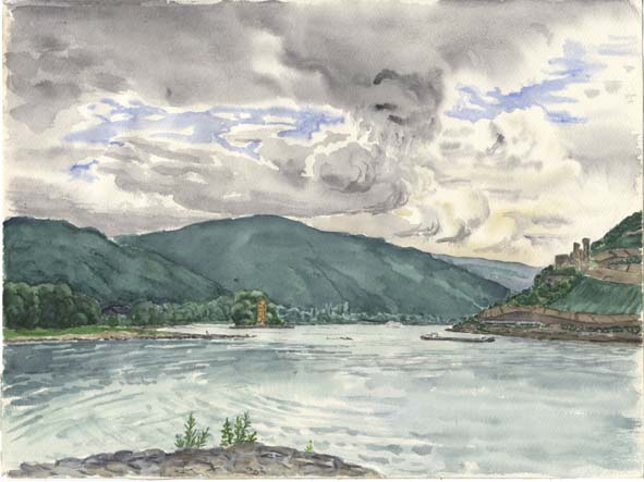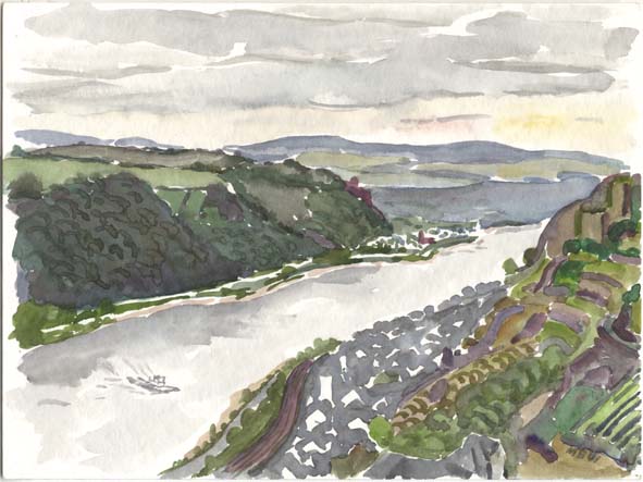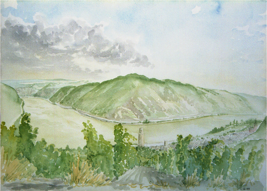 Aus den Weinbergen heraus gemalt, zu sehen sind auch die "Sieben Jungfrauen", eine Felsengruppe im Rheinbett. Clemens malt auch, etwas tiefer am Strassenrand.. | ||