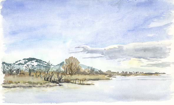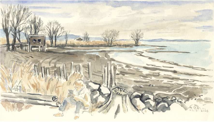 2-S-15-Aq-amRohrspitz-12-2006 | um Weihnachten, bei Niedrigwasser. Das östereichische Bodenseeufer wie hier auf dem Rohrspitz, einer Halbinsel, ist fast überall zugänglich. Typisch sind die in den Schilfflächen versteckten auf Pfählen stehenden Fischerhütten. Der Mensch - hier mit Game-Boy - fügt sich harmonisch in das natürliche Umfeld ein. | ||
