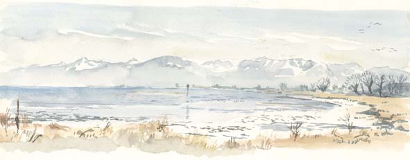 2-S-14-Aq-Appenz-11-1991Blick aufs verschneite Appenzeller Land | Vom Damm der Mündung des "Neuen Rheines" in den Bodensee Blick in Richtung Westen auf die Landzungen Rohrspitz und Rheinspitz und auf das verschneite Appenzeller Land | |||