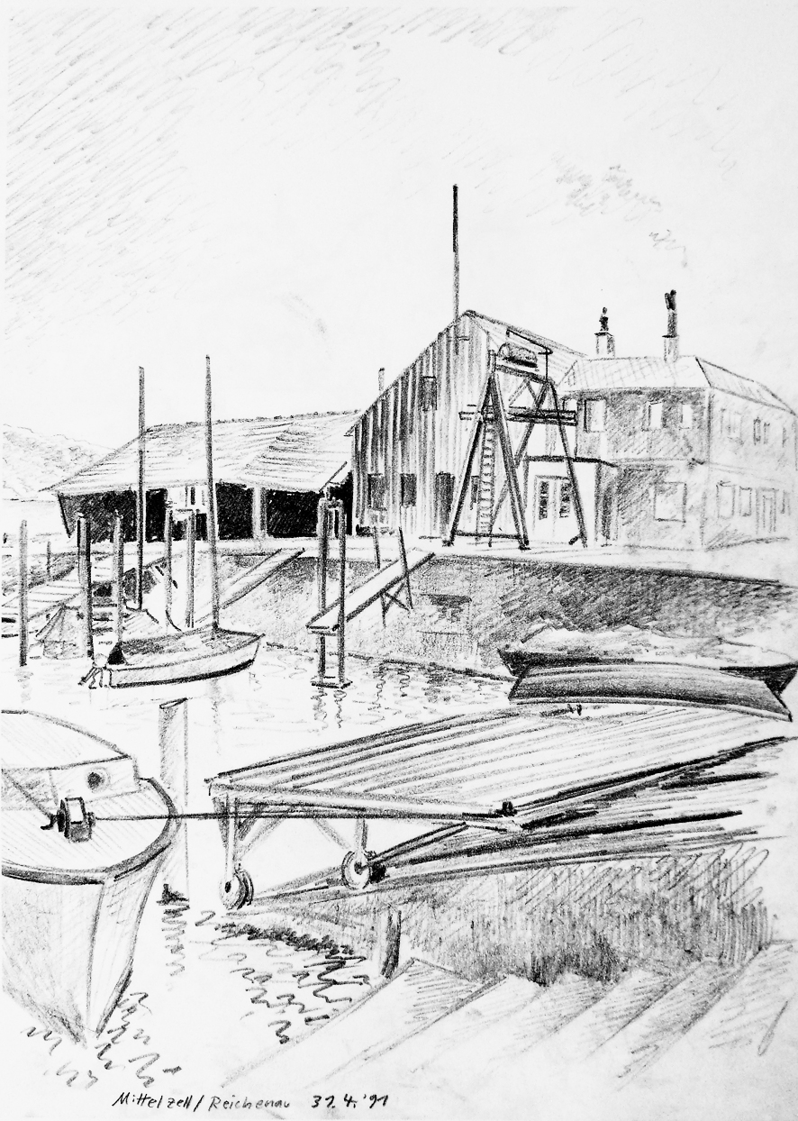 2-S-xx-Clemens-Mittelzell-Reichenau-31-04-1991 kleiner Hafen mit Werft auf der Insel Reichenau (C.H.) |